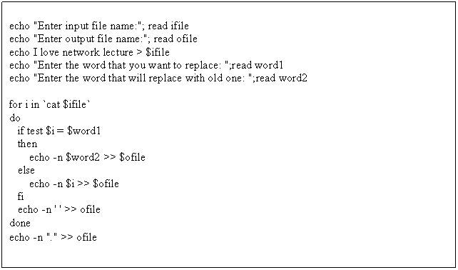 5. Write a shell script that writes “I love network Lectures” into a file then ask user, the word that will be changed and the new word that will be replaced with the old one.