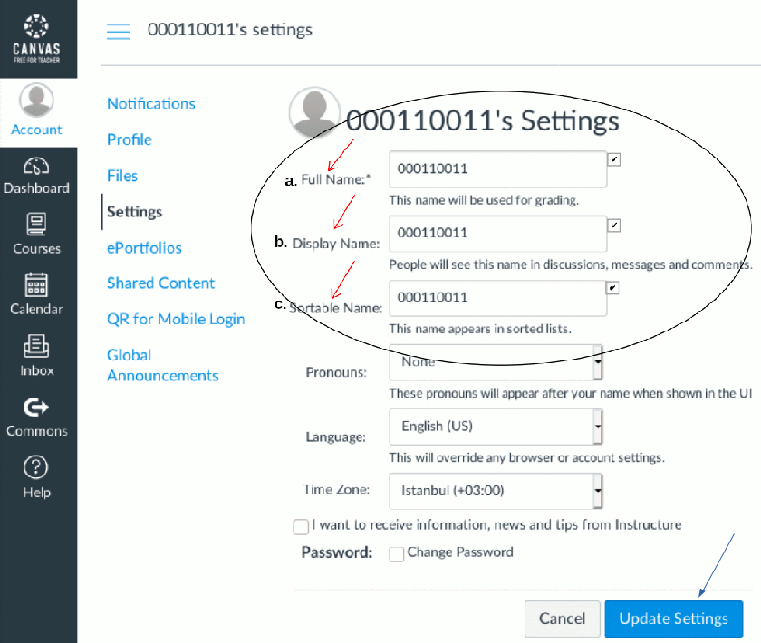 1. STEP2: AFTER SIGN-UP CANVAS:Modify/Correct your account if necessary (see picture below: Full Name, Display Name, Sortable Name). Do not use your name/surname, nicknames or email addresses. Change accordingly to the picture below at left.