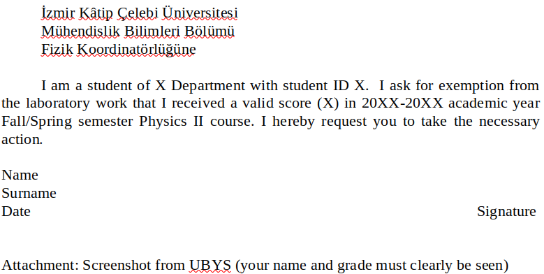 1. The absenteeism limit is 20% of total number of “Laboratory Sessions” of Phys 102. To give an example, if there are 5 total labs, s/he can be 1 lab absent. If you have a valid excuse such as medical report, there will be make-up lab(s) towards end of the semester.